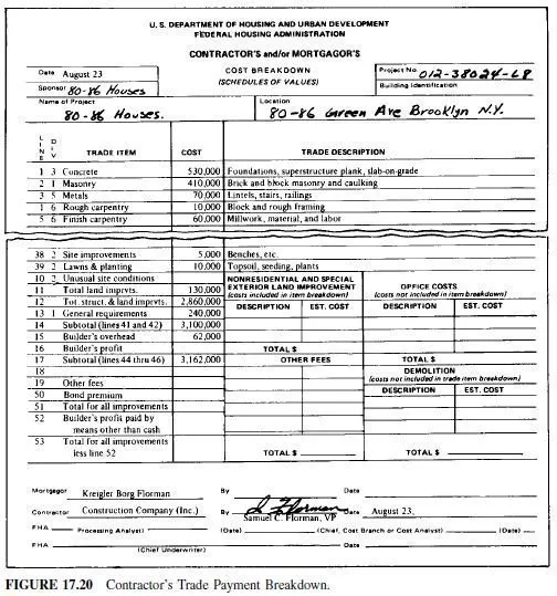 The Contractors Trade Payment Breakdown (Fig. 17.20) is usually prepared by the contractor long in advance of purchase of materials or subcontracts. Therefore, the amounts shown may vary from the actual costs of the various items. In addition to this, the contractor usually has start-up costs for such expenses as mobilization, temporary structures, temporary utilities, and layout, which may not be reflected completely in the breakdown. To offset both of these conditions, the breakdowns may be unbalanced by giving greater value than true costs to the work of some of the trades done early than to the work of the trades done later. This unbalancing will enable the contractor to receive funds for these early start-up costs and thus to be compensated for having to pay various subcontractors and suppliers greater amounts than anticipated at the time the breakdown was prepared. The unbalancing will also make funds available for paying certain subcontractors and suppliers their retained percentages prior to payment of the general contractors retained percentage.