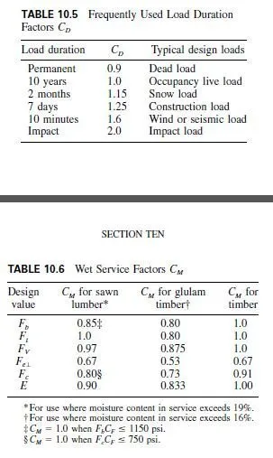 Wood has the capacity to carry substantially greater loads for short periods of time than for long periods. Design values described in Art. 10.3 apply to normal load duration, which is equivalent to application of full design load for a cumulative duration of about 10 years. The full design load is one that stresses a member to its allowable design value. When the cumulative duration of the full design load differs from 10 years, design values, except Fc for compression perpendicular to grain and modulus of elasticity E, should be multiplied by the appropriate load duration factor CD listed in Table 10.5.