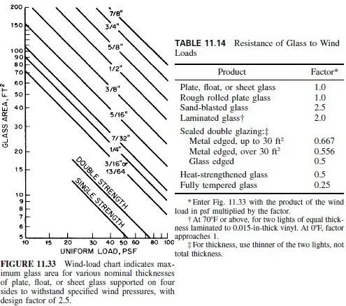 The appropriate thickness for the fabricated glass product is obtained by multiplying the wind load, lb / ft2, by the factor given in Table 11.14. The intersection of the vertical line drawn from the adjusted load and the horizontal line drawn from the glass area indicates the minimum recommended glass thickness. (See also Art. 11.48.3.) Glass producers should be consulted for more accurate thickness recommendations.