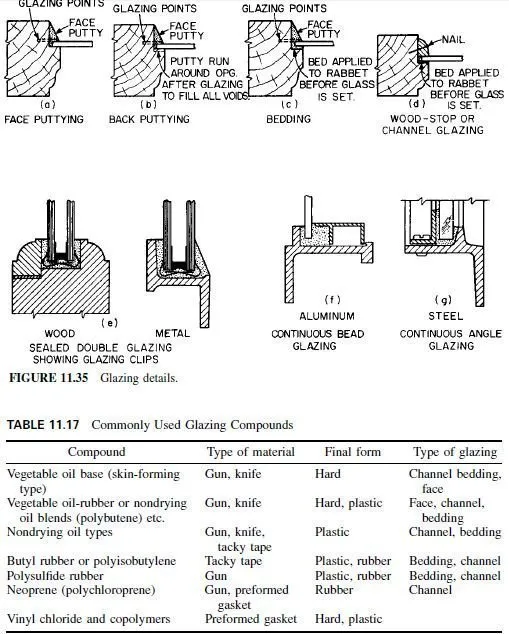 When gaskets are used in concrete wall panels, the entire opening should be cast within one panel. In all cases, the smoothness, tolerance, and alignment of the contact surfaces are very important. The gaskets shown in Fig. 11.36e and Æ’ for use with double glazing require weepholes to allow water that may collect in the gaskets to drain.