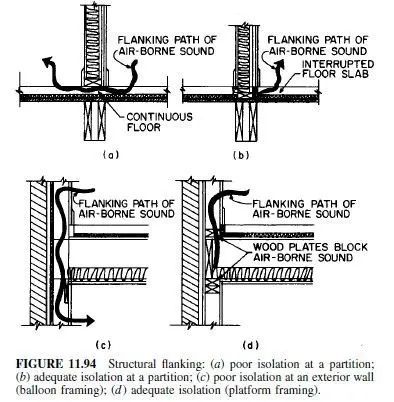Structural flanking via edge attachments and junctions of walls, partitions, floors, and ceilings can seriously degrade the performance of a barrier. Figure 11.94 shows some typical flanking paths and how to avoid such flanking.
