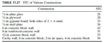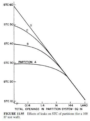 An opening with an area of only about 1 in2 transmits as much acoustical energy??as a 6-in-thick concrete block wall of 100-ft2 area. Figure 11.95 shows the effect of openings of various sizes on walls of various effectiveness. (Note: Sound transmission class STC is a rating system described in Art. 11.80.) The better the wall, the more serious the effect of openings or leaks.