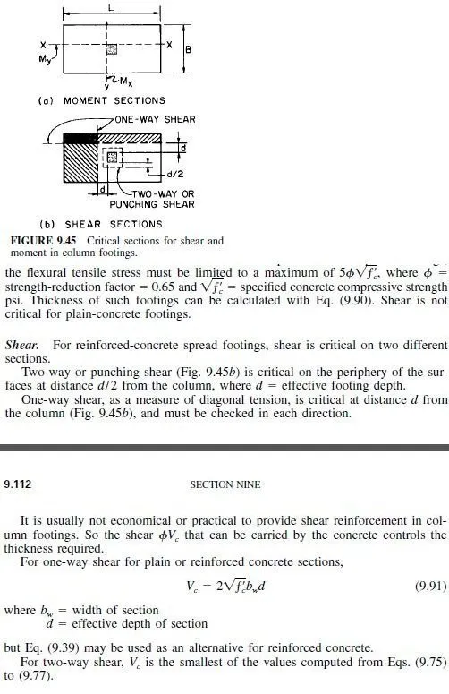 Bending Stresses. Critical sections for moment are at the faces of square and rectangular concrete columns or pedestals (Fig. 9.45a). For round and regular polygon columns or pedestals, the face may be taken as the side of a square having an area equal to the area enclosed within the perimeter of the column or pedestal. For structural steel columns with steel base plates, the critical section for moment may be taken halfway between the face of the column and the edges of the plate.