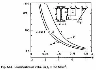 The class of a steel web is strongly influenced by the proportion of its clear depth, d, that is in compression, as shown in Fig.3.14. For the class 1/2 and 2/3 boundaries, plastic stress blocks are used, and the limiting d/t ratios are given in Eurocodes 3 and 4 as functions of α , defined in Fig.3.14. the curves show, for example, that a web with d/t=40 moves from Class 1 to Class 3 when α increases from 0.7 to 0.8. This high rate of change is significant in the design of continuous beams (Section 4.2.1).