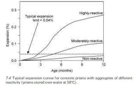 Concrete expansion tests for identifying aggregate reactivity have been standardized in many countries and, although the tests may differ in details, they typically involve the fabrication of concrete prisms using the aggregate under test and specific concrete mixture proportions. In most cases, either the cement content of the mixture or the alkali content of the cement, or both, are increased above normal values to increase the rate of reaction. The prisms are stored in conditions of high humidity (e.g. over water in sealed containers) and, usually, at elevated temperature (e.g. 38ëC/100ëF is widely used) to further accelerate the rate of reaction. The length change of the prisms is monitored during storage and the expansion is used to determine the reactivity of the aggregate. Figure 7.4 shows typical expansion curves for concrete prisms manufactured using a non- reactive, moderately-reactive and highly-reactive aggregate. Although expan- sion limits and test durations vary between different guidelines and specifica- tions, a widely-used limit for identifying reactive aggregates is 0.04% after 12 months storage at 38ëC. In other words, aggregates that produce concrete expansion less than this value are considered innocuous (non-reactive) and those that produce expansion above this value are considered to be potentially reactive. Concrete prism tests are generally considered to be suitable for evaluating both alkali-silica and alkali-carbonate reactivity. Potentially reactive aggregates should either be avoided or only used in concrete with appropriate preventive measures (see Section 7.7).