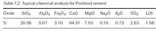 where Na2Oe is the equivalent sodium content, Na2O is the sodium oxide content, K2O is the potassium oxide content and the 0.658 is a conversion factor based on the relative molecular weights of the oxides (Na2O/K2O). A typical chemical analysis for a Portland cement is shown in Table 7.2. The equivalent alkali content of this particular cement is 0.63% Na2Oe (ˆ 0.15% ?? 0.658 x 0.73%) and the equivalent alkali content of Portland cements generally ranges from about 0.20 to 1.20% Na2Oe.