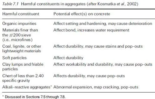 The presence of even small amounts of harmful constituents and impurities in aggregates can have a major impact on concrete performance and thus it is important to be able to identify the type and amount of these undesired materials. Table 7.1 provides a broad overview of the various harmful con- stituents of concern and their potential effects on concrete (Kosmatka et al., 2002). The material found in the minus #200 fractions or `microfines’ is particularly of interest, as impurities and clays are often found in this range. It is good practice to routinely measure the amount of microfines, and when concerned about the nature of the microfines, additional testing may be warranted. Simple tests like the sand equivalent test (AASHTO T 176) and methylene blue test (AASHTO TP 57) are useful in assessing the relative amount of `clay-like’ materials and trying to identify smectite clays in aggregates, respectively. Some clays can adversely affect concrete workability and can interact with some polycarboxylate-based superplasticizers (lowering the efficiency of their water-reducing action). The presence of mica, which can be quantified petrographically by point count, is important because excessive mica contents (> 10% in specific size fraction) may lead to increased water demand, segregation, and bleeding (Rogers, 2002).
