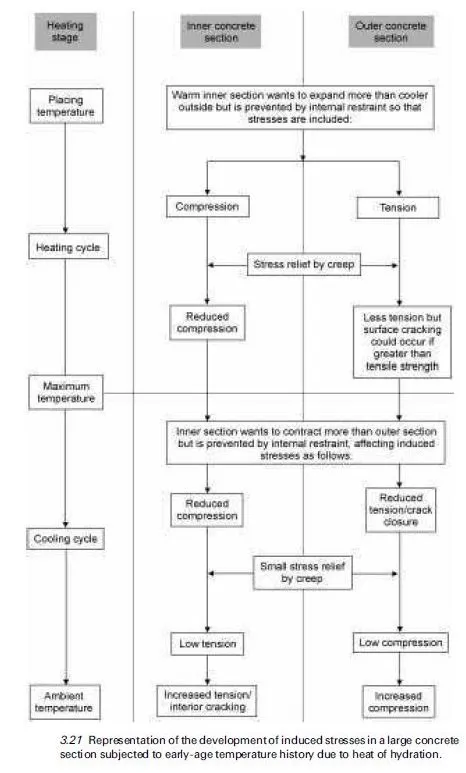 Figure 3.21 illustrates the stress induced when concrete is subjected to early-age temperature history. After placing a large mass of concrete, the temperature rise due to the heat of hydration generated causes the interior of the concrete to become hotter than the surface layers, where heat is lost to the atmosphere unless the mass is completely insulated. The consequent differential expansion results in the interior section being restrained by the outer section generating compressive stresses in the interior and tensile stresses in the surface section. These stresses are relieved to a significant extent by creep, as illustrated in Fig. 3.22, since at this stage creep is large because the concrete is young and of low maturity. At peak temperature, the interior section will be in relieved compression, while the surface could crack if the relieved tensile stress exceeds the tensile strength of the young concrete (Fig. 3.22).
