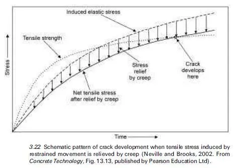 It is important to note that the tensile creep rupture strength, fcr, which determines the condition for cracking in the cases of early age thermal cracking and restrained drying shrinkage cracking, is less than the value determined in the laboratory under short-term loading and typically it is taken as 60% of the short- term strength (see Section 3.2.4).