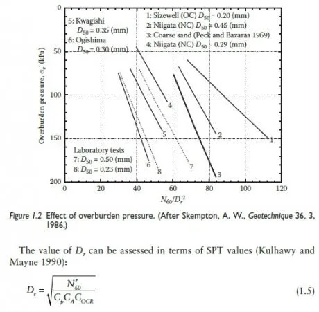 where C DC t p A = 60 + 25 = 1 2 + 0 05 0 01 50 log , . . log( . ) and COCR = OCR0.18; Dr = relative density (in decimal form); Cp = grain-size correction factor; CA = aging correction factor; COCR = overconsolidation correction factor; D50 = grain size at which 50% of the soil is finer (mm); t = age of soil (time since deposition)(years); and OCR = overconsolidation ratio.