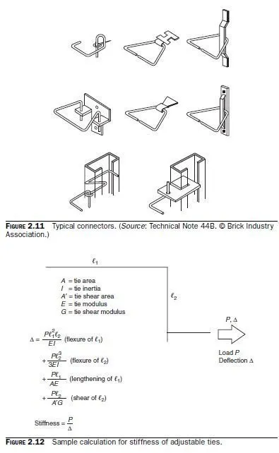 Typical uses of each type of connector are shown in Figs. 2.9 through 2.11. Figure 2.9 shows typical veneer ties. Figure 2.10 shows typical adjustable pintle ties. Figure 2.11 shows typical connectors.