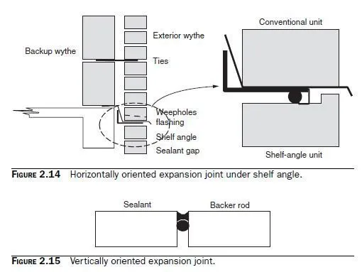 1. Expansion joints, shown in Figs. 2.14 and 2.15, are used in clay masonry to accommodate expansion. In these figures the backer rod is shown separated from the sealant, so that they can be distinguished. In reality, they are in contact.