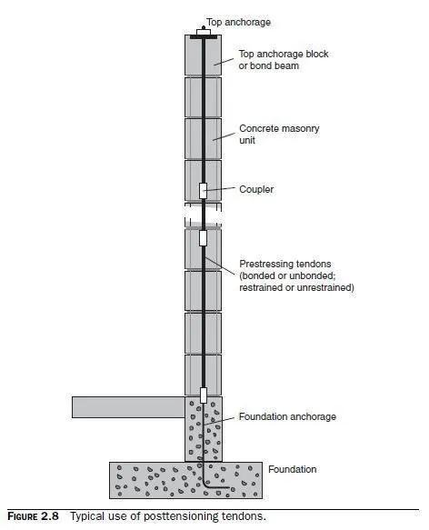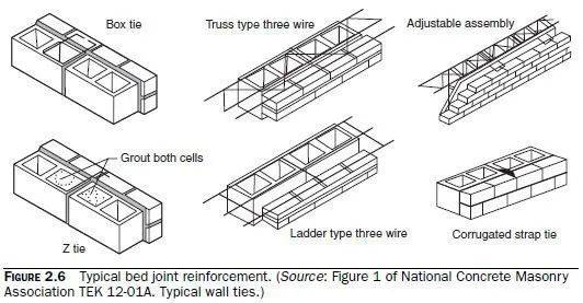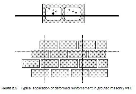 Typical uses of each type of reinforcement are shown in Figs. 2.5 through 2.8. Figure 2.5 shows deformed reinforcing bars in a grouted masonry wall. Figure 2.6 shows joint reinforcement. Figure 2.7 shows welded wire reinforcement in the topping of a floor slab connected to a masonry wall. Figure 2.8 shows posttensioning tendons in a masonry wall.