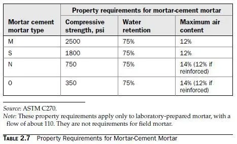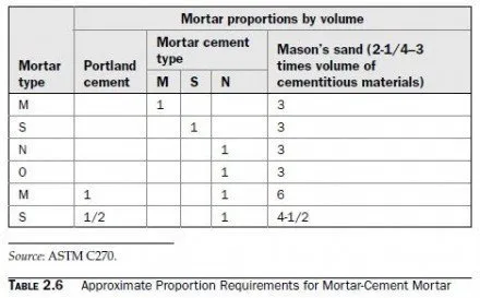 Approximate proportion requirements for mortar-cement mortar are given in Table 2.6. The proportions given in that table are near the midpoints of the ranges of proportions required by ASTM C270. When specifying a mortar by the proportion specifications of ASTM C270, it is not necessary to specify the proportions, only the mortar type. By far the most common types are single-bag mixes (the first four lines of the table). Types M and S mortar-cement mortar can also be made, however, by adding portland cement to Type N mortar cement. Property requirements for mortar-cement mortar from ASTM C270 are repeated in Table 2.7.