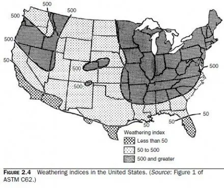 The required durability and freeze-thaw resistance determine whether the units need to conform to Grade NW, MW, or SW. The required durability and freeze-thaw resistance depend on the weathering index (product of the average annual number of freezing cycle days and the average annual winter rainfall in inches), defined in detail in ASTM C62 and depicted in Fig. 2.4. Negligible weathering regions have weathering indices of less than 50; moderate weathering regions have weathering indices between 50 and 500; and severe weathering regions have weathering indices in excess of 500.
