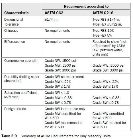 Under ASTM C62 (Building Brick), Grade NW brick are recommended for interior use only. Grade MW brick are permitted for use in severe weathering regions. Grade SW brick are recommended for use in severe weathering regions, and whenever brick are in contact with the ground, or laid in horizontal surfaces, or likely to be permeated with water. Under ASTM C216 (Facing Brick), there are no Grade NW brick. Grade MW brick are permitted for use in severe weathering regions. Grade SW brick are required for use whenever the weathering index is greater than or equal to 500, and whenever brick in other than vertical surfaces are in contact with soil. Requirements of ASTM C62 and C216 for clay units are summarized in Table 2.9.