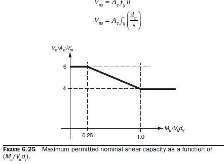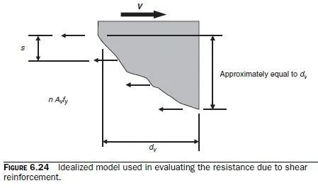 The nominal resistance from reinforcement is taken as the area associated with each set of shear reinforcement, multiplied by the number of sets of shear reinforcement crossing the hypothetical failure surface. Because the hypothetical failure surface is assumed to be inclined at 45°, its projection along the length of the member is approximately equal to dv, and number of sets of shear reinforcement crossing the hypothetical failure surface can be approximated by (dv/s):