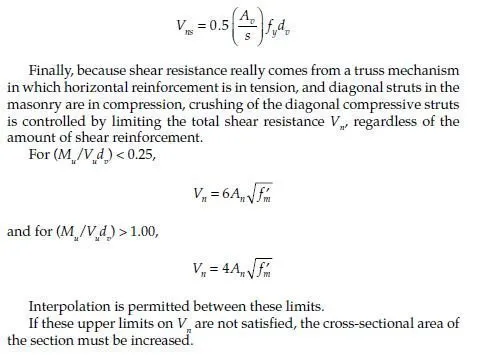 The actual failure surface may be inclined at a larger angle with respect to the axis of the wall, however. Also, all reinforcement crossing the failure surface may not yield. For both these reasons, the assumed resistance is decreased by an efficiency factor of 0.5. From the 2008 MSJC Code, Sec. 3.3.4.1.2.2,