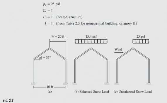 roofs with ya15, and to hip and gable roofs with y less than the larger of 2.38 and ð70=Wà þ 0:5, where W is the horizontal distance from the eave to the ridge in feet. In some structures, the snow load acting on only a part of the roof may cause higher stresses than when the entire roof is loaded. To account for such a possibility, the ASCE 7 Standard recommends that the e¤ect of unbalanced snow loads also be considered in the design of structures. A detailed description of unbalanced snow load distributions to be considered in the design of various types of roofs can be found in the ASCE 7 Standard. For example, for gable roofs with [larger of 2.38 and ð70=Wà þ 0:5 aya70 and W a20 ft, the ASCE 7 Standard specifies that the structures be designed to resist an unbalanced uniform load of magnitude PgI applied to the leeward side of the roof, with the windward side free of snow.