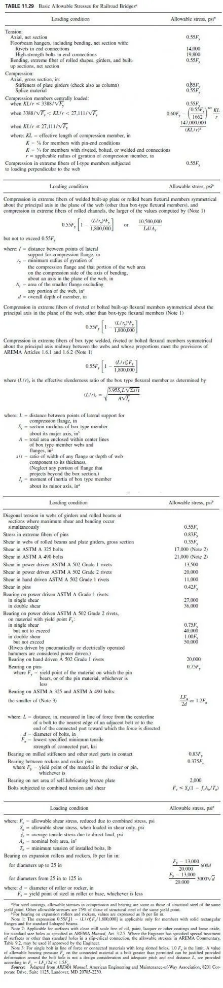 Table 11.29 lists the allowable stresses for railroad bridges recommended in the AREMA Manual. The stresses, ksi, are related to the specified minimum yield stress Fy , or the specified minimum tensile strength Fu , ksi, of the material except where stresses are independent of the grade of steel. The basic stresses may be increased for loading combinations (Art. 11.35.12), or may be superseded by allowable fatigue stresses (Art. 11.38).