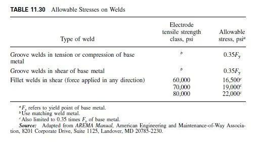 Allowable stresses for welds for railroad bridges are given in Table 11.30. These stresses may also be increased for loading combinations (Art. 11.35.12), or may be superseded by allowable fatigue stresses (Art. 11.38). The designer should review the AREMA Manual for complete provisions, including prohibited types of welds and joints. Special provisions may apply for fracture critical members.