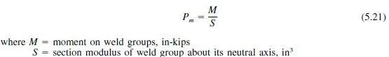 In addition, the moment is resisted by the upper portion of the welds in tension and the pressure of the lower part of the bracket against the support. Both the elastic and inelastic methods assume that the weld carries all the load (bearing pressure between the bracket and the lower part of the support is neglected). The neutral axis is taken at the center of gravity of the weld group. The intensity of load at any point in the weld is proportional to the distance from the neutral axis, and the resisting moment per inch is proportional to that distance. For the elastic method, tension (kips per in) at the most heavily stressed point of the welds may be computed from