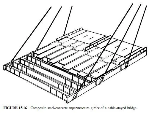 Other so-called steel cable-stayed bridges are, in reality, composite structures with concrete pylons, structural-steel edge girders and floorbeams (and possibly stringers), and a composite cast-in-place or precast plank deck. The precast deck concept is illustrated in Fig. 15.16.