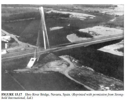 three spans; or multiple spans. Single-span cable-stayed bridges are a rarity, usually dictated by unusual site conditions. An example is the Ebro River Bridge at Navarra, Spain (Fig. 15.17). Generally, back stays are anchored to deadman anchorage blocks, analogous to the simple-span suspension bridge (Fig. 15.9a).