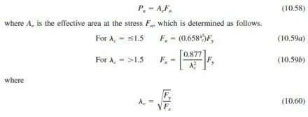 Fe is the least of the elastic flexural, torsional and torsional-flexural buckling stresses (Arts. 10.14.110.14.3). Equation 10.59a is based on elastic buckling while Eq. 10.59b represents inelastic buckling, providing a transition to the yield point stress as the column length decreases.