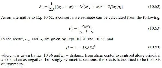 Singly-Symmetric Sections. For singly-symmetric sections, such as C-sections, subject to torsional-flexural buckling, Fe is the smaller of Eq. 10.61 and that given by Eq. 10.62 or 10.63.