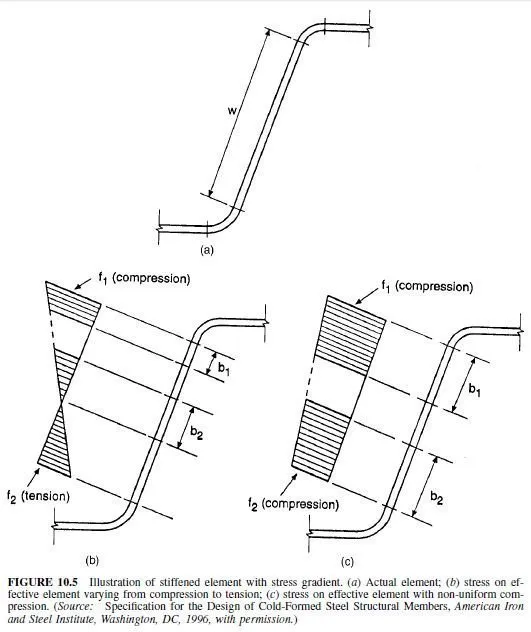 Elements with stress gradients include webs subjected to compression from bending alone or from a combination of bending and uniform compression. For load capacity determination, the effective widths b1 and b2 illustrated in Fig. 10.5 must be determined. First, calculate the ratio of stresses