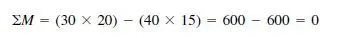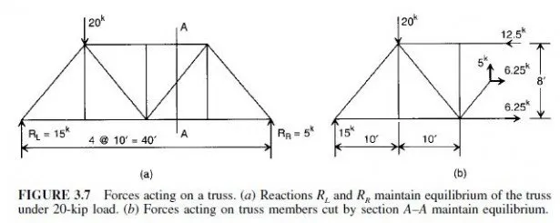 Figure 3.7a shows a truss that is in equilibrium under a 20-kip (20,000-lb) load. By Eq. (3.11), the sum of the reactions, or forces RL and RR, needed to support the truss, is 20 kips. (The process of determining these reactions is presented in Art. 3.29.) The sum of the moments of all external forces about any point is zero. For instance, the moment of the forces about the right support reaction RR is