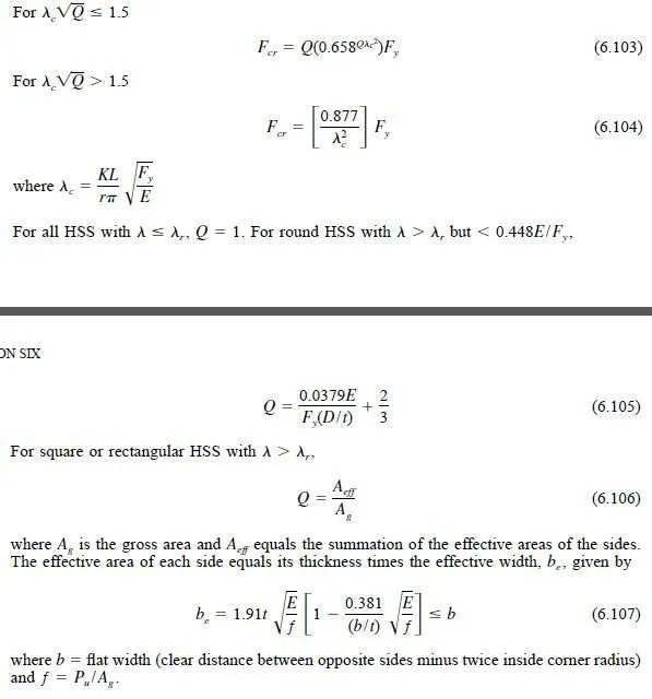 Design strength for flexural buckling is determined by a procedure similar to that of Art. 6.10.2 using Eq. 6.39. However, in determining the critical stress, Fcr, a Q factor is introduced to account for local buckling effects. The provisions of the HSS Specification are as follows: