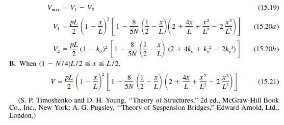 Much of the literature on classical suspension-bridge theory deals with the effects of minor terms neglected in the assumptions of the deflection theory. S. P. Timoshenko gave an excellent account of the effect of horizontal displacements of the cable, elongation of suspenders, shear deflections, and temperature changes in the cable. (S. P. Timoshenko and D. H. Young, Theory of Structures, 2d ed., McGraw-Hill, Inc., New York.) Other investigators have extended the theory to stiffening trusses that are continuous (such as in the Salazar Bridge) or have variable moments of inertia, widely spaced or inclined suspenders, or multiple main spans.