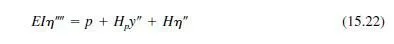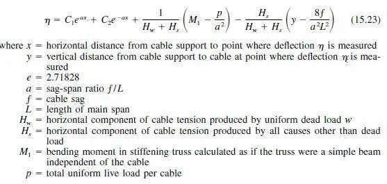 With the notation and assumptions given for the elastic theory in Art. 15.16.1, a differential equation can be written for the structure in Fig. 15.46 to include the vertical defection of the cable (and stiffening truss) at any point x. This equation expresses the flexural relationship between the horizontal component of cable tension H under dead and live loads and the stiffening-truss deflection under uniform live load p: