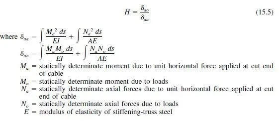 Equation (15.22) by itself is not sufficient for solution for the two unknowns, and the horizontal component of cable tension Hp due to live load. (Note: H can be expressed in terms of Hp .) Therefore, an additional compatibility equation is necessary. It expresses the cable condition that the total horizontal projection of cable length between anchorages remains unchanged.