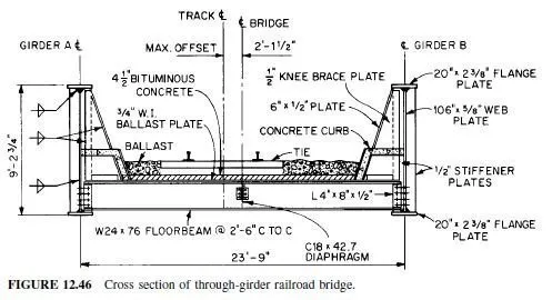Article 12.11 presents an example to indicate the design procedure for a through girder bridge with floorbeams. Because the example in Art. 12.9 dealt with highway loading, additional information is provided by designing a railroad bridge in the following example.