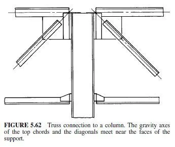 At columns, if the reactions of trusses on opposite sides of a support differ by only a small amount (up to 20%), the gravity axes of end diagonal and chord may be allowed to intersect at or near the column face (Fig. 5.62). The connections need be designed only for the truss reactions. If there is a large difference in reactions of trusses on opposite sides of the support, or if only one truss frames into a column, the gravity axes of diagonal and chord should be made to intersect on the column gravity axis. Shear and moment in the column flange should be considered in design of the end connection.