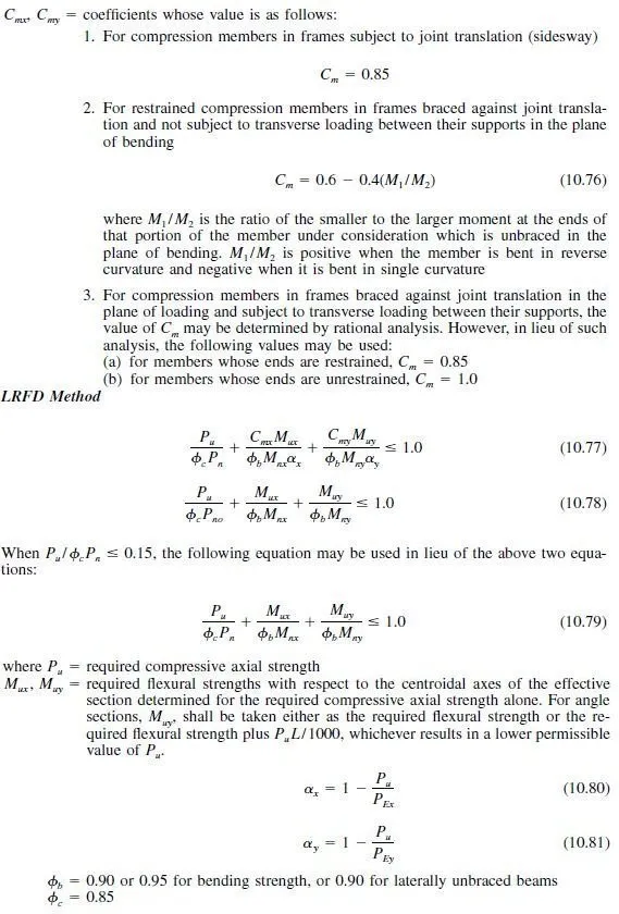 Members under combined compression axial load and bending are generally referred to as beam-columns. Bending in such members may be caused by eccentric loading, lateral loads, or end moments, and the compression load can amplify the bending. These members must satisfy the interaction equations given by the AISI Specification to prevent both buckling and yielding. Separate equations are given for ASD and LRFD but symbols have common definitions except as noted.