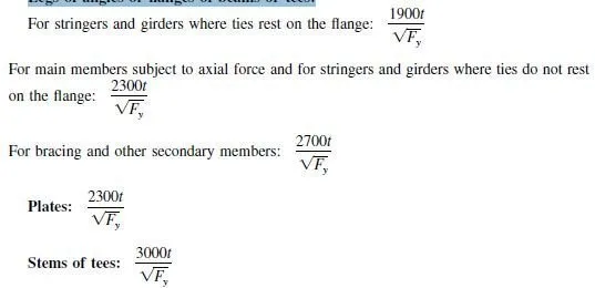 The width, in, of the outstanding elements of compression members should not exceed the following values expressed in terms of the element thickness, t, in, and the material yield point, Fy , psi.