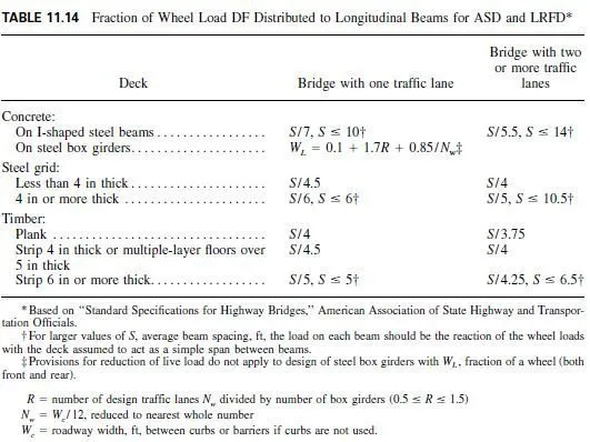 Moments in Longitudinal Beams. For ASD and LRFD, the fraction of a wheel load listed in Table 11.14 should be applied to each interior longitudinal beam for computation of liveload bending moments.