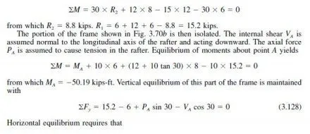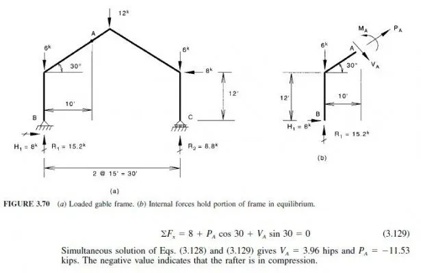 As an example, suppose that the forces and moments at point A in the roof purlin of the gable frame shown in Fig. 3.70a are to be calculated. Support B is a hinge. Support C is on rollers. Support reactions R1, H1, and R2 are determined from equations of equilibrium.