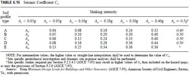 Coefficients CV and Ca are based on the soil profile and are determined as follows. From the descriptions in Table 6.13, determine the soil profile type for the site under consideration. From Fig. 6.2, determine the effective peak acceleration, Aa . Enter Tables 6.14 and 6.15 with Aa and the soil type to find coefficients CV and Ca . For the cases noted in Table 6.14, CV depends upon the effective peak velocity-related acceleration, AV , Fig. 6.3. The response modification factor, R, depends upon the structural bracing system used as detailed in Table 6.15. The higher the factor, the more energy the system can absorb and hence the lower the design force. For example, ordinary moment frames are assigned a factor of 3 and special moment frames a factor of 8 (see Art. 9.7.1). Note that the forces resulting from the application of these R factors are intended to be used in LRFD design, not at an allowable stress level (see Art. 6.12).