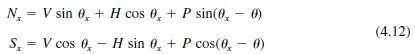 When the reactions have been determined for an arch (Arts. 4.1 to 4.3), the principal forces acting on any cross section can be found by applying the equilibrium laws. Suppose, for example, the forces H, V, and M acting at the elastic center of a fixed arch have been computed, and the moment Mx , shear Sx , and axial thrust Nx normal to a section at X (Fig. 4.4) are to be determined. H, V, and the load P may be resolved into components parallel to the thrust and shear, as indicated in Fig. 4.4. Then, equating the sum of the forces in each direction to zero gives