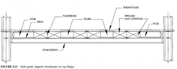This system utilizes floorbeams that are supported on top of, rather than framed into, stub girders. Thus, the floorbeams are designed as continuous members, which results in steel savings and reduced deflections. A stub girder consists of a shallow wide-flange member directly beneath the floorbeams, and intermittent wide-flange stubs, having the same depth as the floorbeams. The stubs are placed perpendicular to and between the floorbeams, leaving space for the passage of mechanical ductwork (Fig. 8.21). The stubs are welded to the top of the stub girder and connect to the floor deck, which is typically concrete fill on metal deck, thereby enabling the stub girder to act compositely with the floor deck.