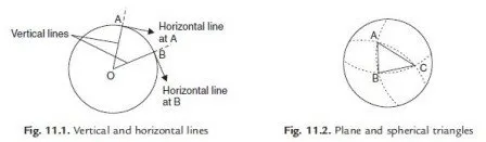 Obviously, the vertical and horizontal lines at another point B are not parallel to the respective lines at A. It should be noted that all lines lying on the earths surface are curved lines and all triangles are spherical triangles as shown in Fig. 11.2. Hence, surveying involves spherical trigonometry.