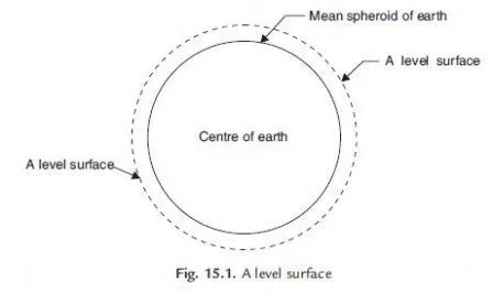 1. Level Surface: A surface parallel to the mean spheroid of the earth is called a level surface and the line drawn on the level surface is known as a level line. Hence all points lying on a level surface are equidistant from the centre of the earth. Figure 15.1 shows a typical level surface.